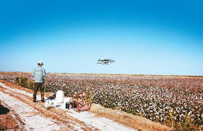 棉花采摘前,有一项重要工作——脱叶。在新疆维吾尔自治区阿克苏地区温宿县,三和植保公司的飞手朱锐握着手柄站在田边,一架M—22植保无人机在棉田上空来回穿梭,喷淋脱叶剂。