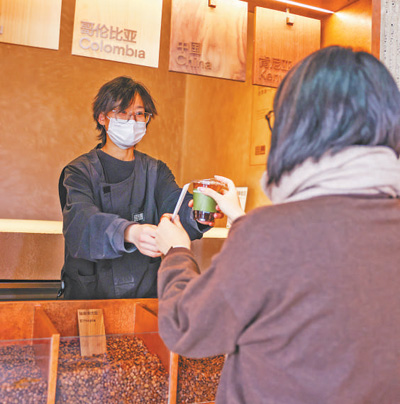 咖啡店店员向顾客递上制好的饮品。